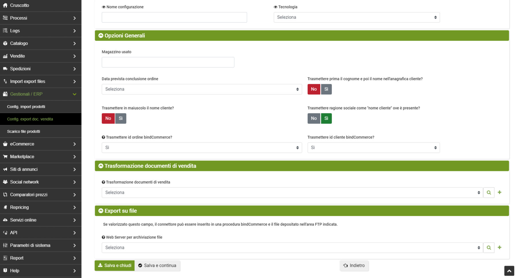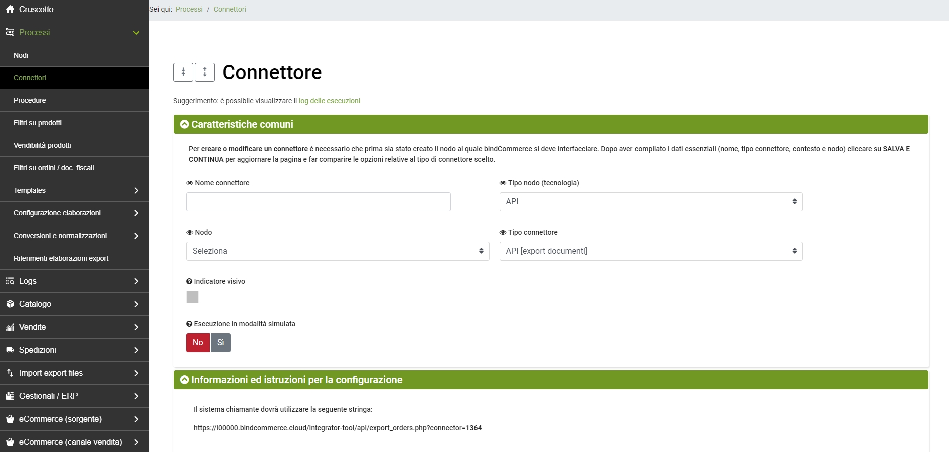 La scelta di quali ordini/documenti esporre all’API viene effettuata attraverso l’interfaccia di bindCommerce. E’ possibile creare più connettori (che corrispondono a differenti URL da chiamare da parte del sistema esterno), ognuno dei quali rispondente ad una differente configurazione (filtro di quali ordini restituire all’API).