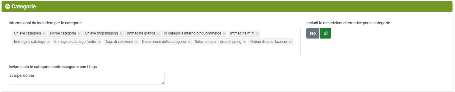 Selezionando l’esportazione delle categorie sarà possibile selezionare i campi da includere nel file generato, se includere le descrizioni alternative e specificare uno o più tag (separati da virgola) che verranno utilizzati come filtro per selezionare le categorie da includere.
