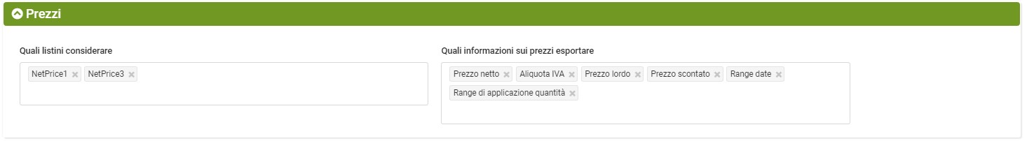 Selezionando l’esportazione dei Prezzi sarà possibile definire i listini da esportare e le informazioni sui prezzi da includere.