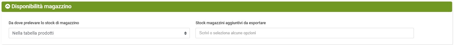 Scegliendo di esportare le disponibilità sarà possibile definire se prelevare le disponibilità dalla tabella Prodotti oppure da un magazzino specifico e selezionare eventuali stock aggiuntivi da includere