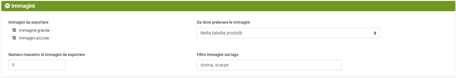 Se è state selezionata l’esportazione delle immagini è possibile scegliere il tipo di immagine da esportare, se prelevare le immagini dalla tabella Prodotti o da una Alternativa e il numero massimo di immagini da esportare. Sarà inoltre possibile definire un elenco di tag separato da virgole che verrà usato come filtro per le immagini (verranno selezionato le immagini che hanno almeno un tag tra quelli specificati)
