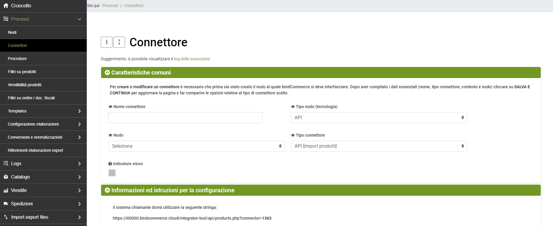 Per creare il connettore che consentirà di importare i prodotti dal gestionale API a bindCommerce recarsi al menù: