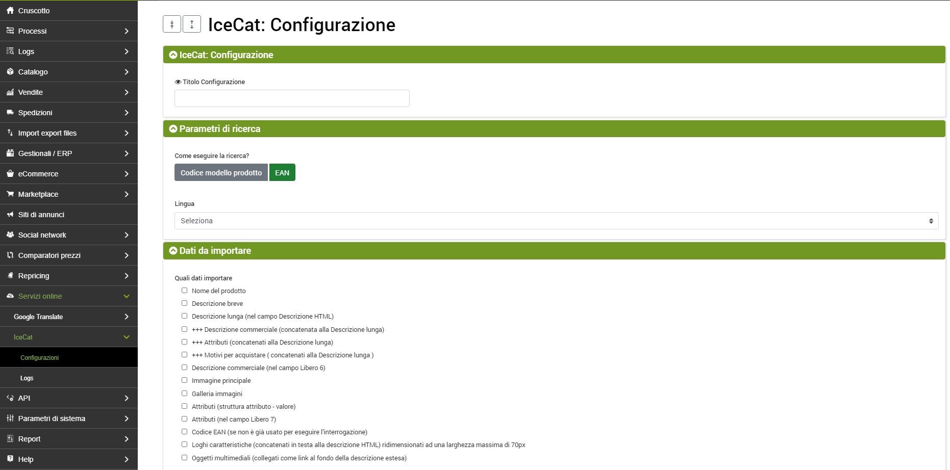 • Lingua: definisce quale lingua interrogare su IceCat (in altre parole quali descrizioni richiedere)