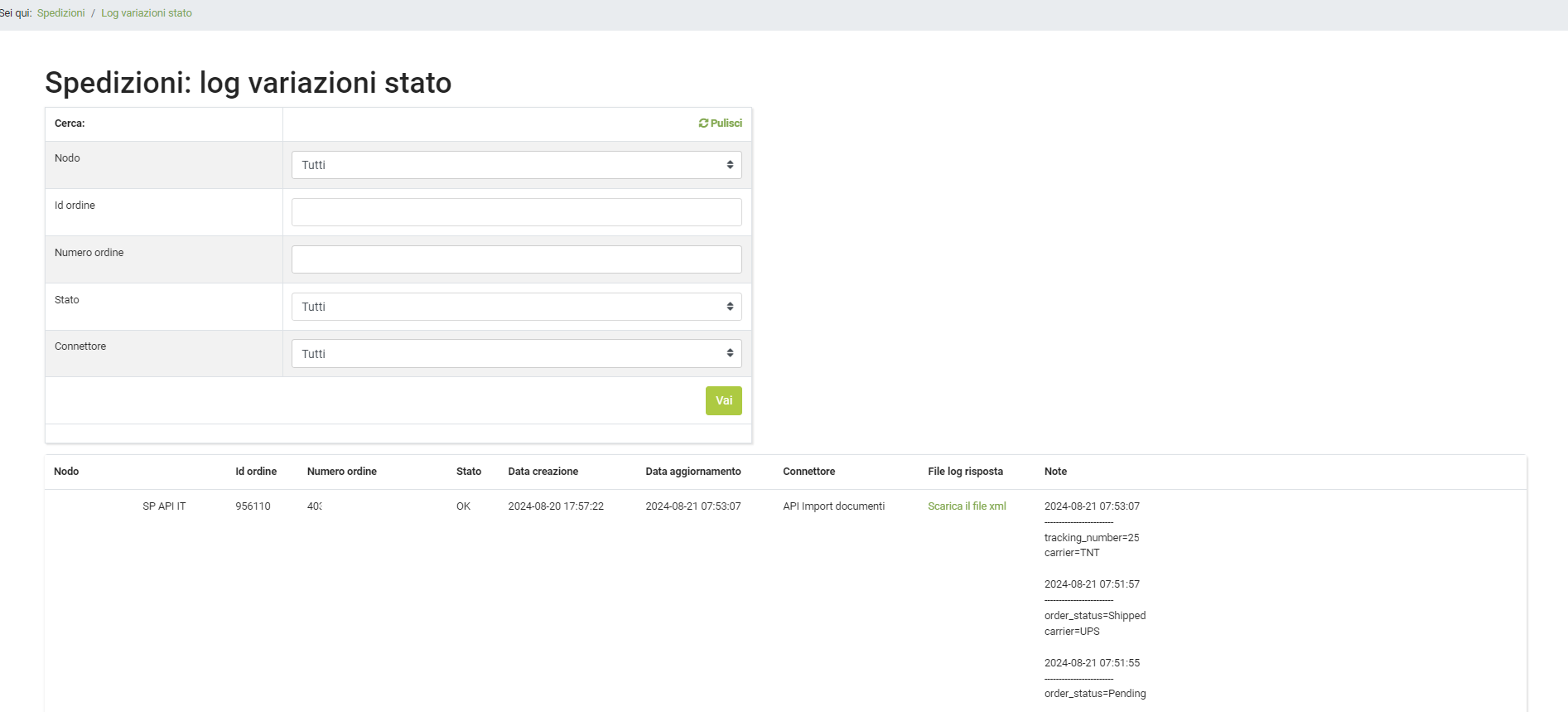- Connettore: indicazione del connettore che ha aggiornato l’ordine.