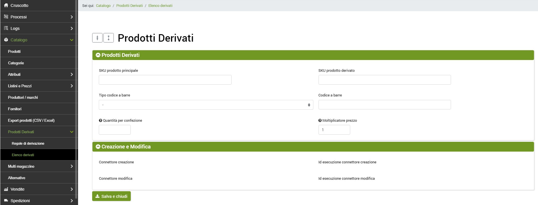 - Codice a barre: inserire il codice a barre da associare al prodotto derivato. Se non si dispone del codice a barre è possibile replicare lo sku inserito nel campo SKU Derivato