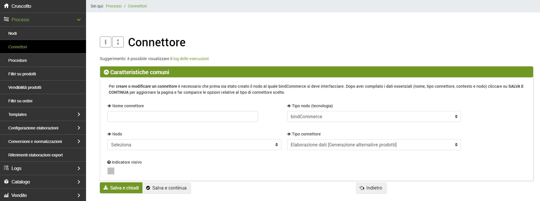 • Nodo: il nodo di tipo bindCommerce precedentemente creato
