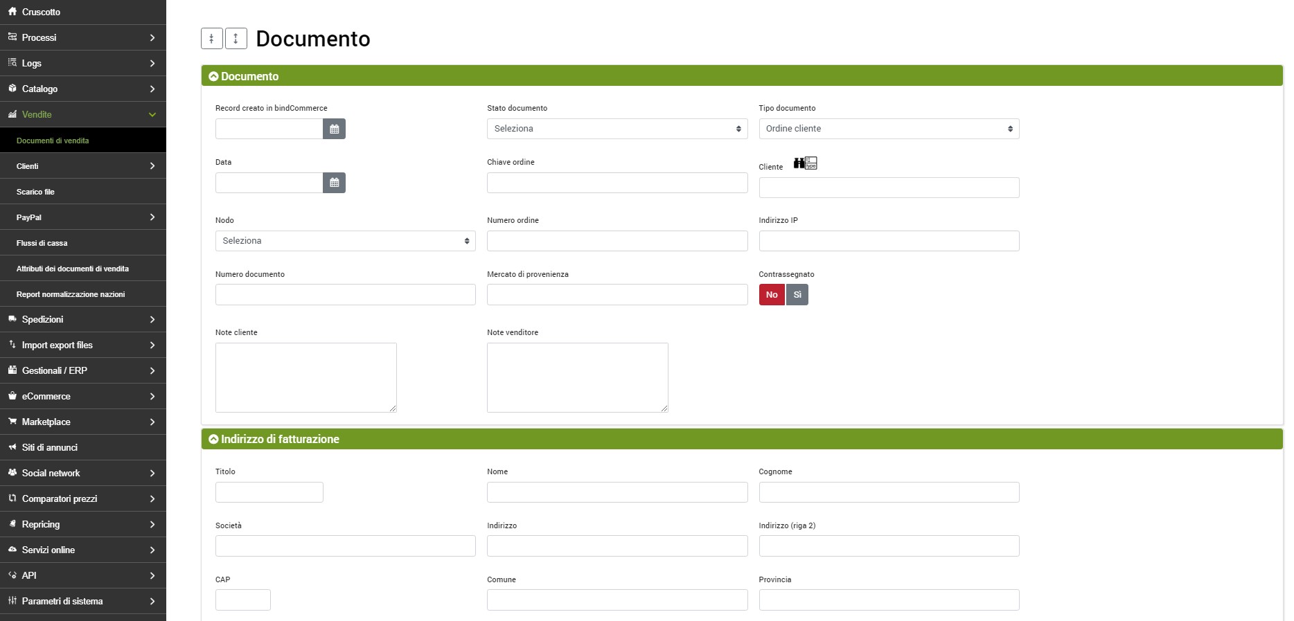 - Record creato in bindCommerce: data in cui l'ordine è stato effettivamente importato in bindCommerce. Non è detto che coincida con il campo Data