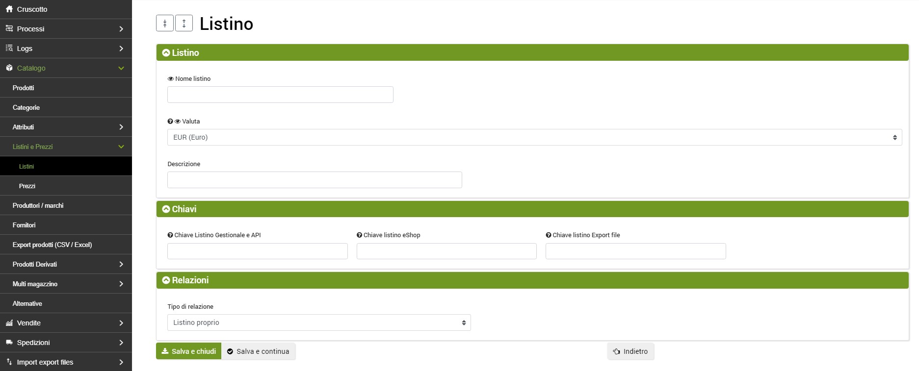 Cliccando su Aggiungi in alto a sinistra, e compilando i campi richiesti, si potrà creare un nuovo listino.