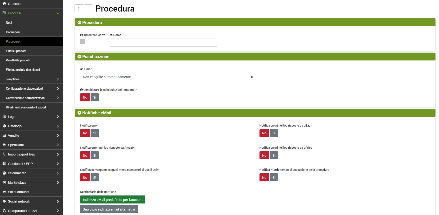 Ogni procedura dispone inoltre di una sezione dedicata alle notifiche via mail di errori, ritardi nell’esecuzione, numero di connettori eseguiti e alert specifici per i logs dei connettori di alcuni marketplace.