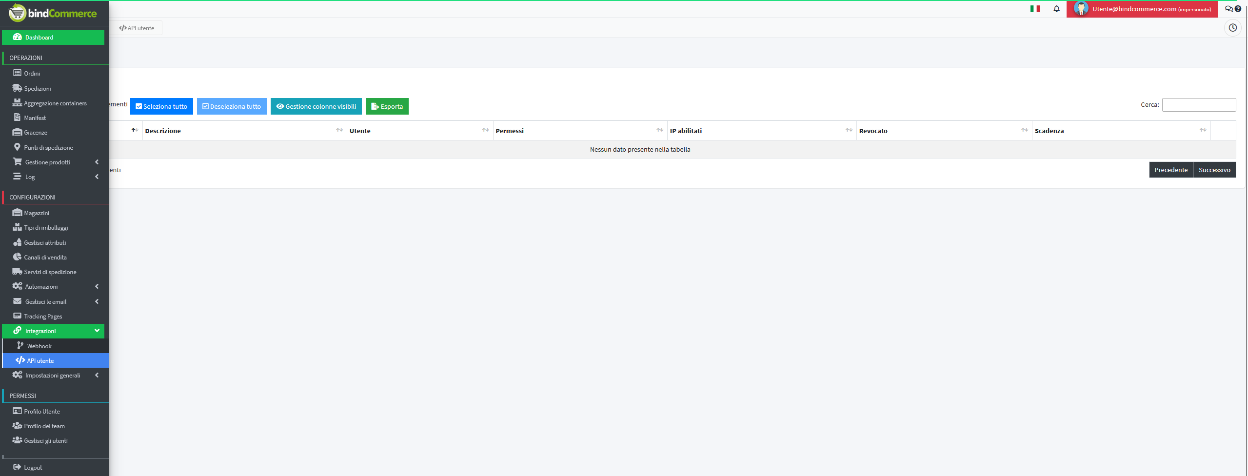 Entrare quindi nel proprio spazio utente bindShipping e recarsi in menu > configurazioni > integrazioni > API utente
