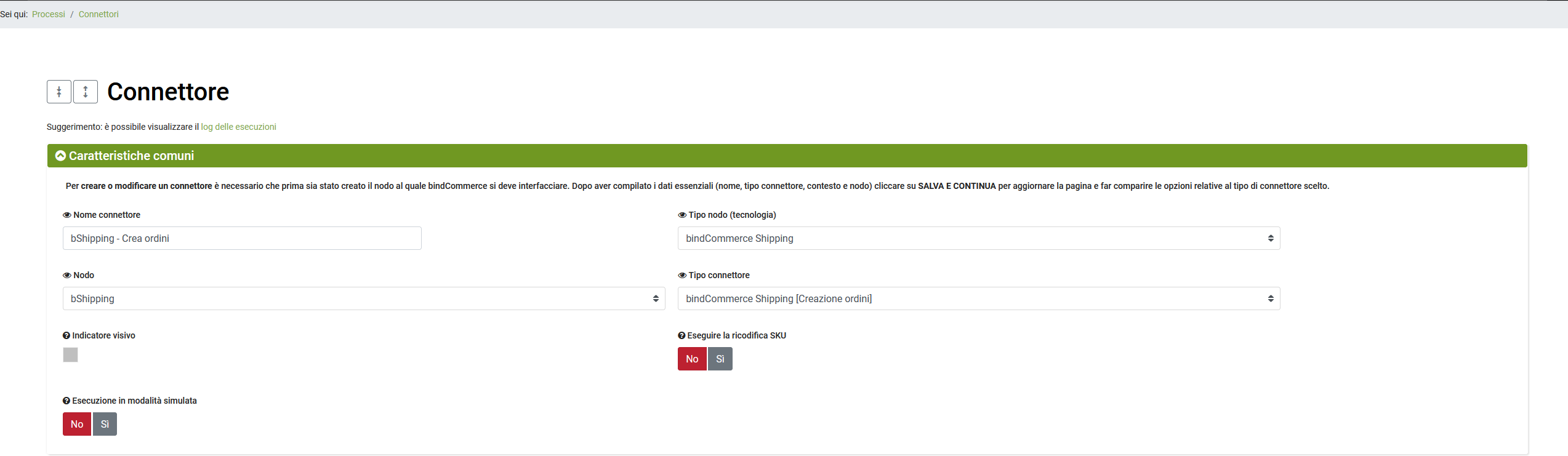 - Tipo connettore: selezionare bindCommerce Shipping [Creazione ordini].