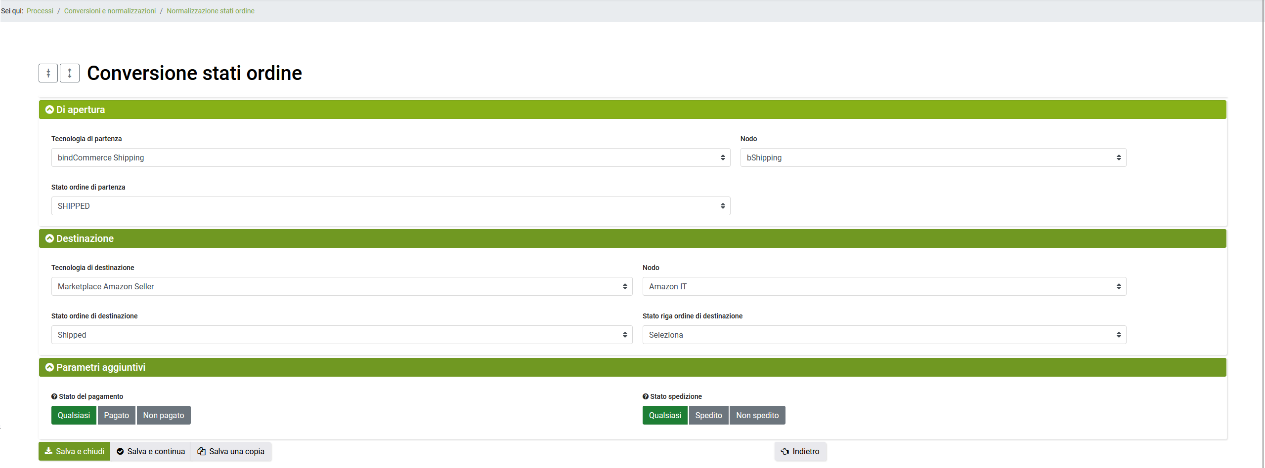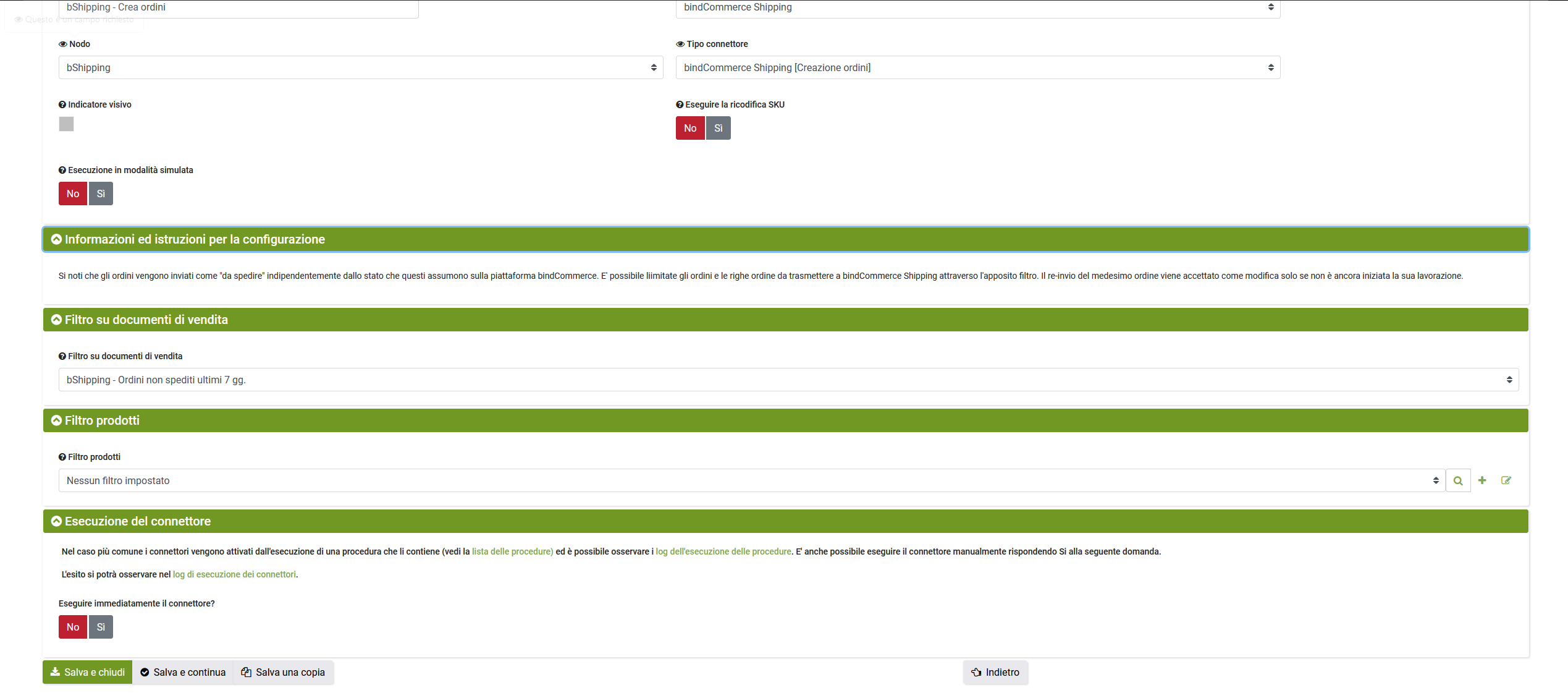 - Nodo: selezionare il nodo di tipologia “bindCommerce Shipping” creato in precedenza.