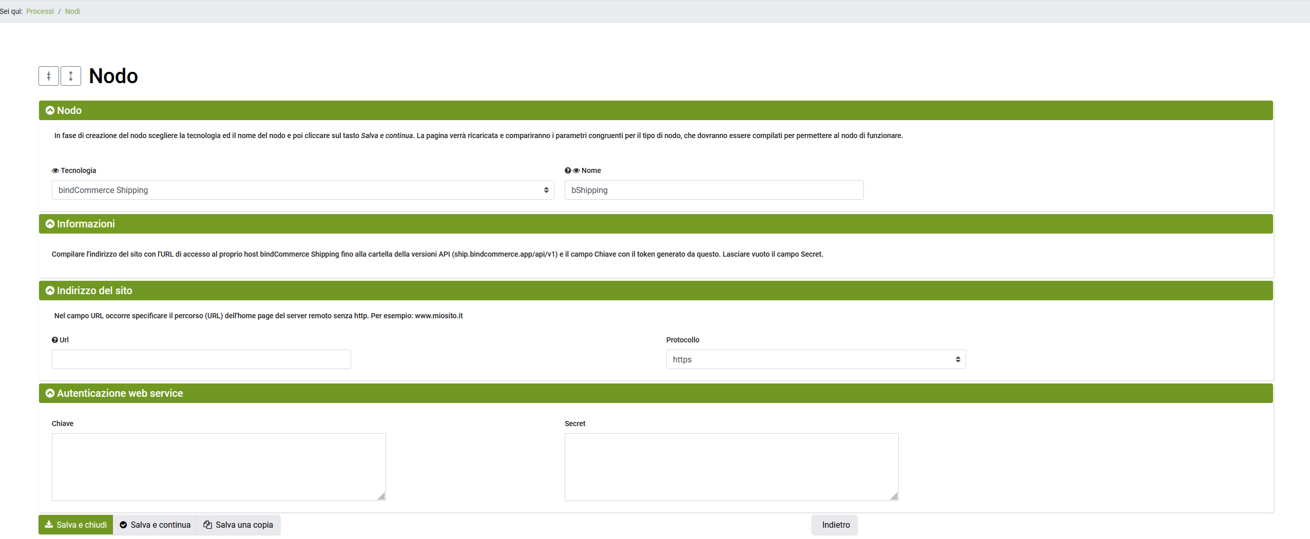 - Tipo nodo (tecnologia): selezionare “bindCommerce Shipping”.