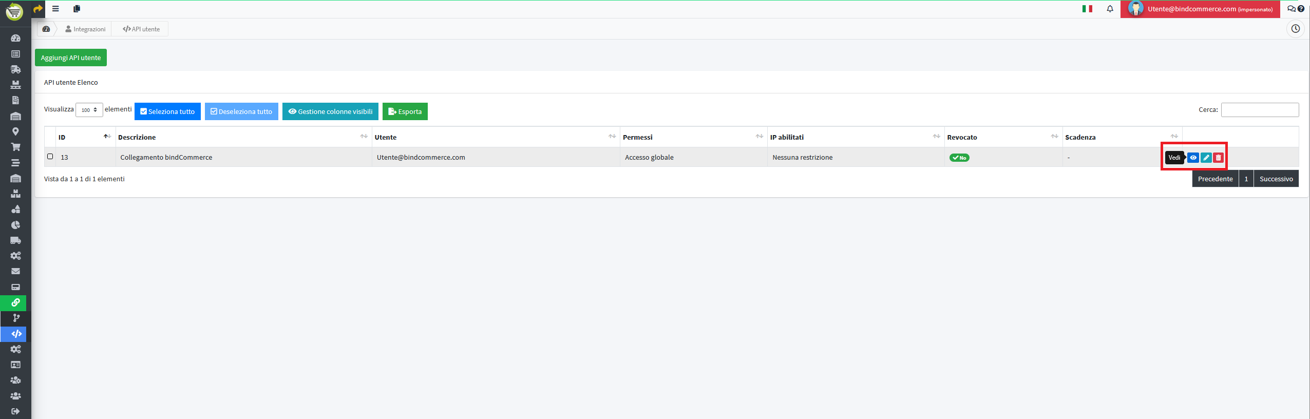Cliccando sul pulsante blu “vedi” a fianco all’utente API si possono vedere le informazioni dell’utente appena creato, con annessa chiave API che tornerà utile durante la configurazione del nodo su bindCommerce.