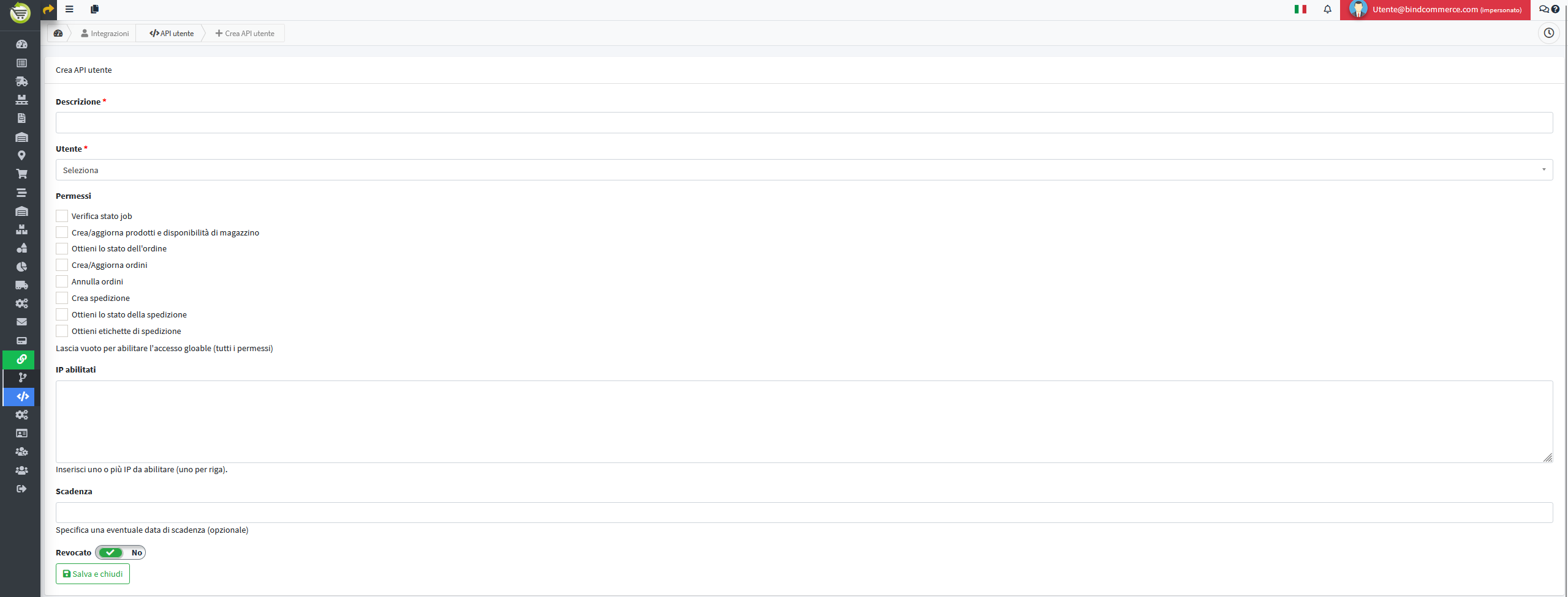 - Descrizione: inserire una descrizione per riferimento/identificazione (ad esempio bindCommerce).