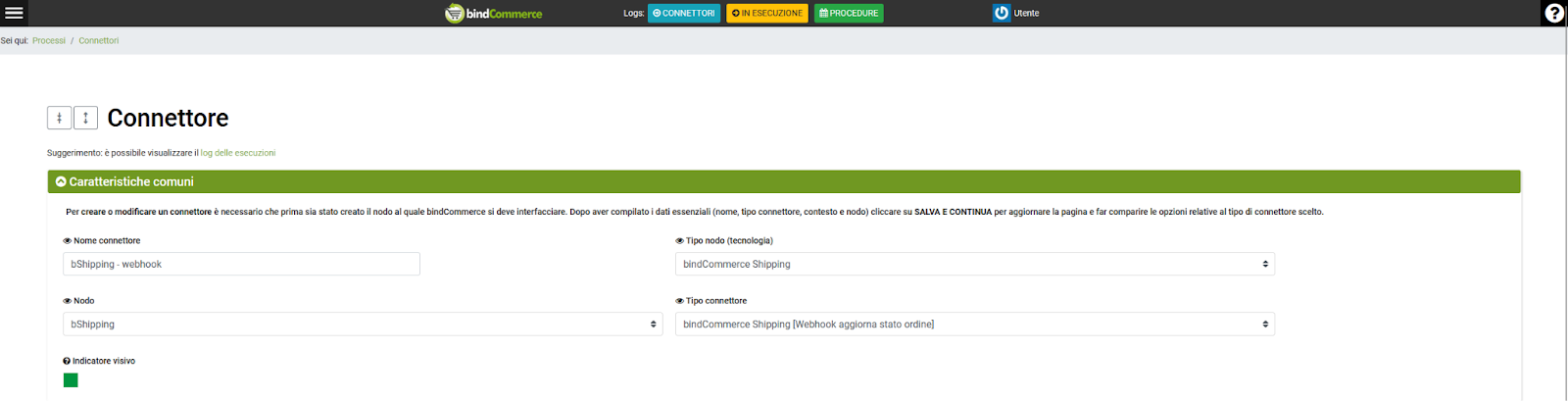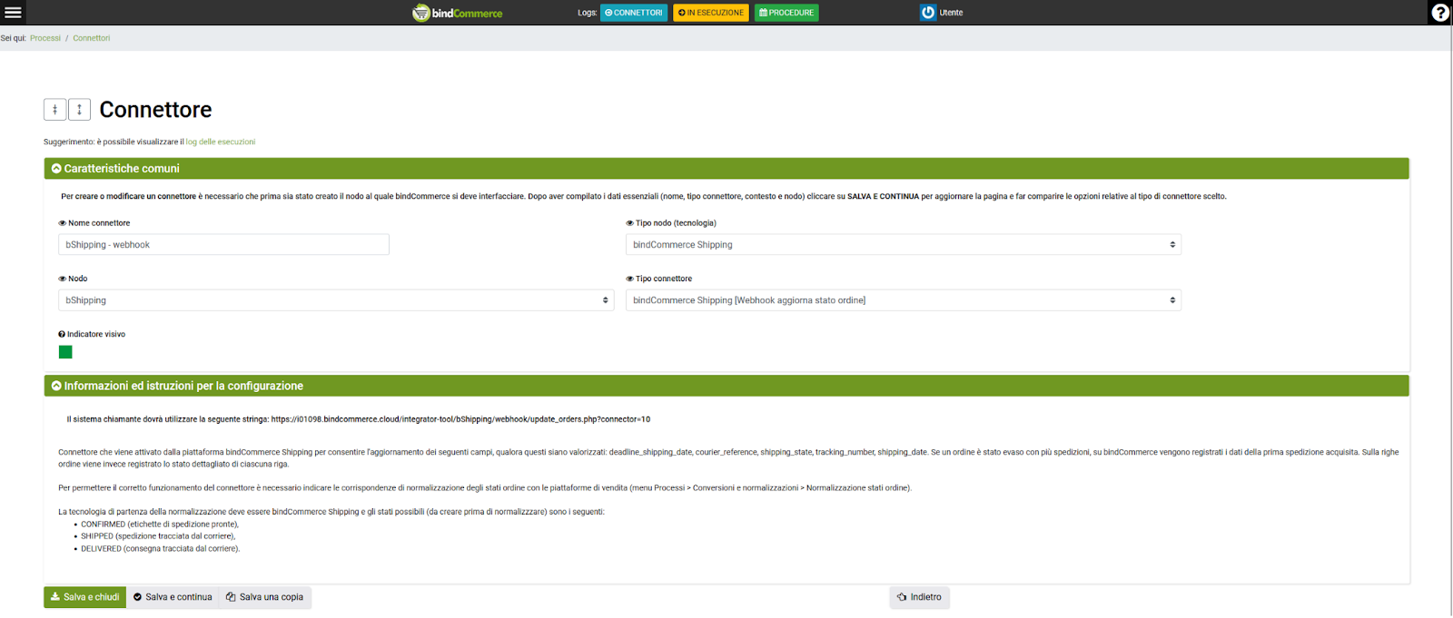 - Tipo connettore: selezionare “bindCommerce Shipping [Webhook aggiorna stato ordine]”.