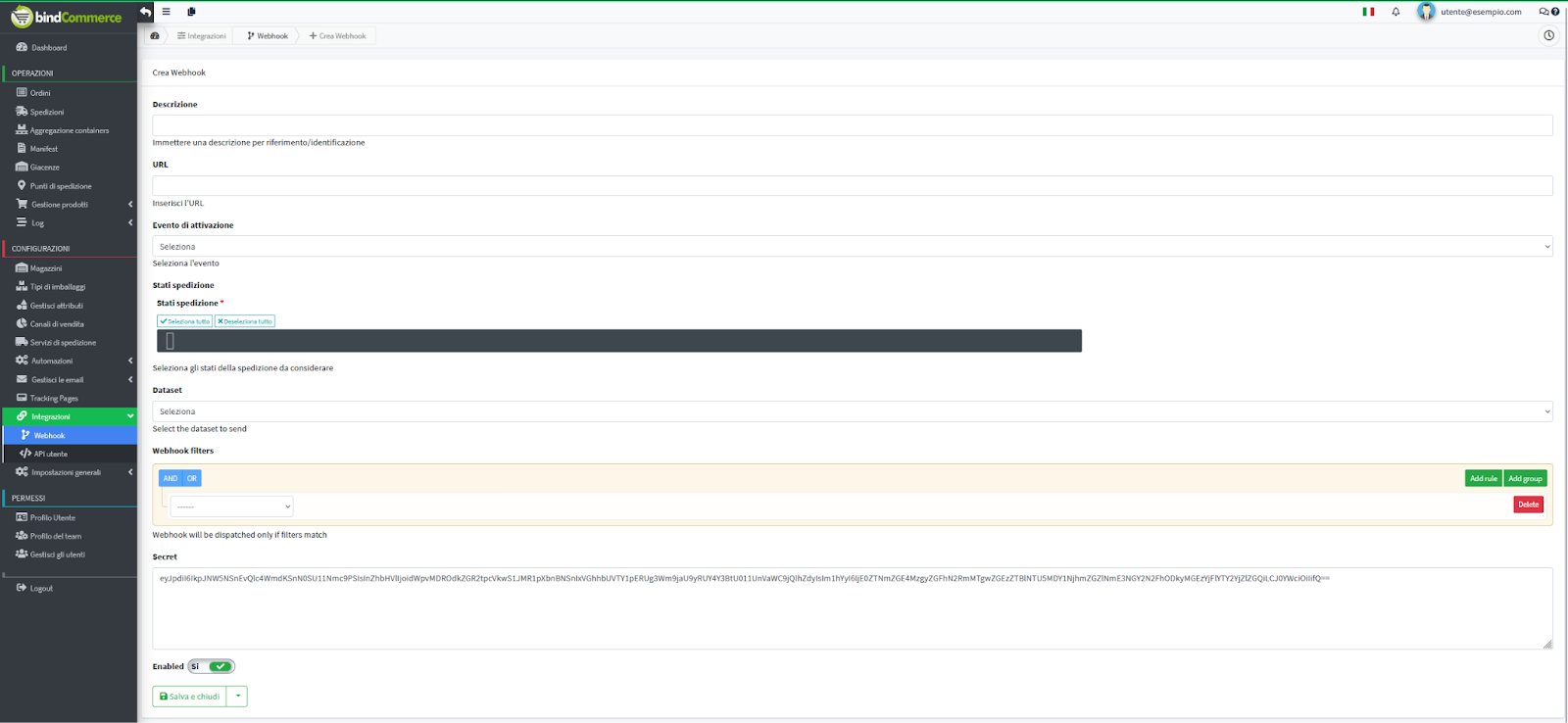 - Webhook filters: è possibile inserire filtri specifici per stabilire quali spedizioni considerare.