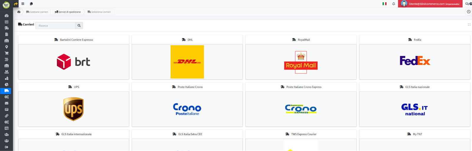 Recandosi in menu > configurazioni > servizi di spedizione è possibile aggiungere e configurare i servizi di spedizione desiderati: bindShipping dispone dei servizi di spedizione più conosciuti, tra cui GLS, Bartolini e Poste Italiane, ma non solo.
