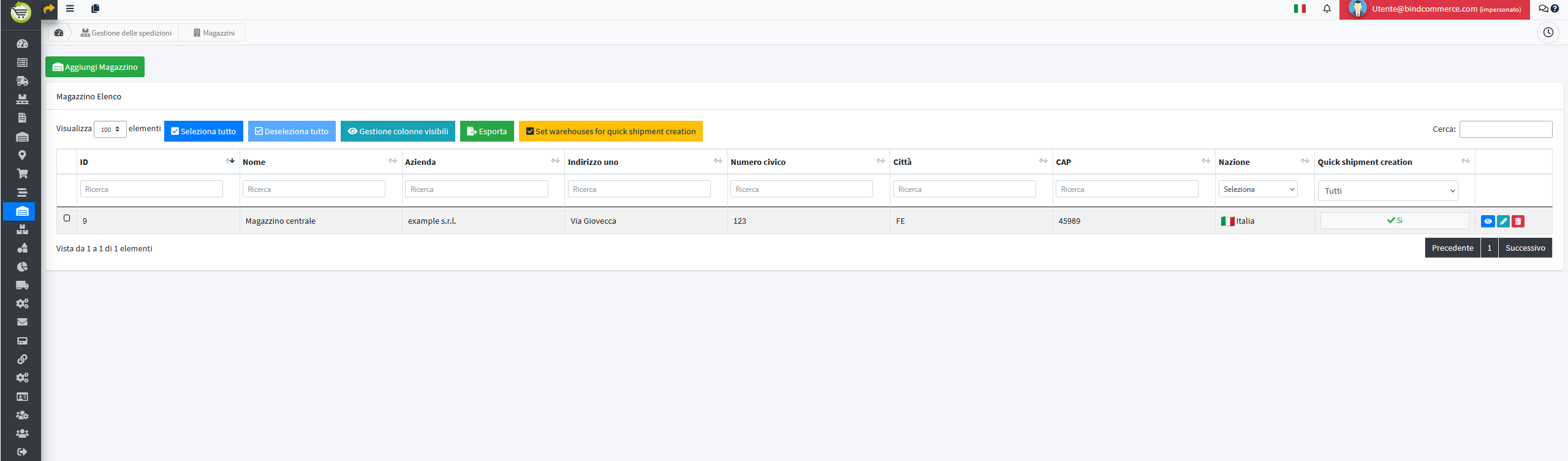 La sezione Magazzini è la sezione dedicata alla creazione, visualizzazione e/o modifica dei magazzini da cui potranno partire le spedizioni create tramite bindShipping.