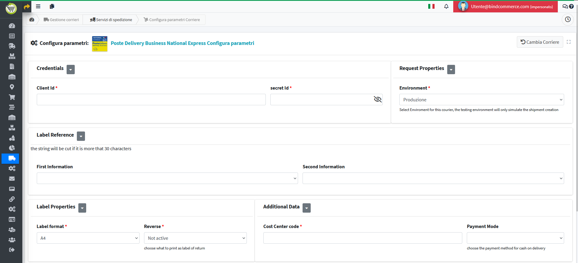 Per integrare il corriere PDB - Poste Delivery Business nei servizi di spedizione su bindShipping occorre reperire e inserire le seguenti credenziali: