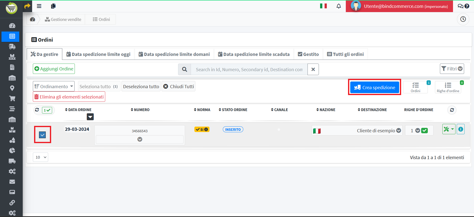 Per creare una spedizione a partire da ordini già presenti a bindShipping occorre recarsi in menu > operazioni > ordini, selezionare l’ordine per il quale si intende creare la spedizione e cliccare sul pulsante blu “Crea spedizione”.