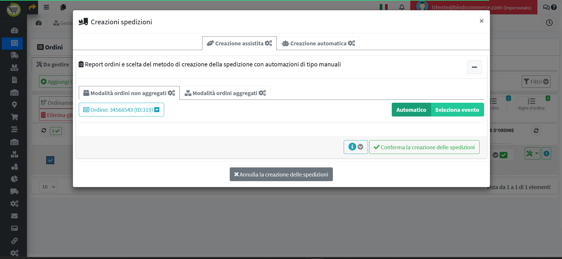 - Automatico: Selezionando questa opzione verrà utilizzato il primo evento disponibile tra quelli creati nella configurazione delle spedizioni assistite, se e solo se le informazioni relative all’ordine rispettano le condizioni applicate ai filtri dell’evento in questione.
