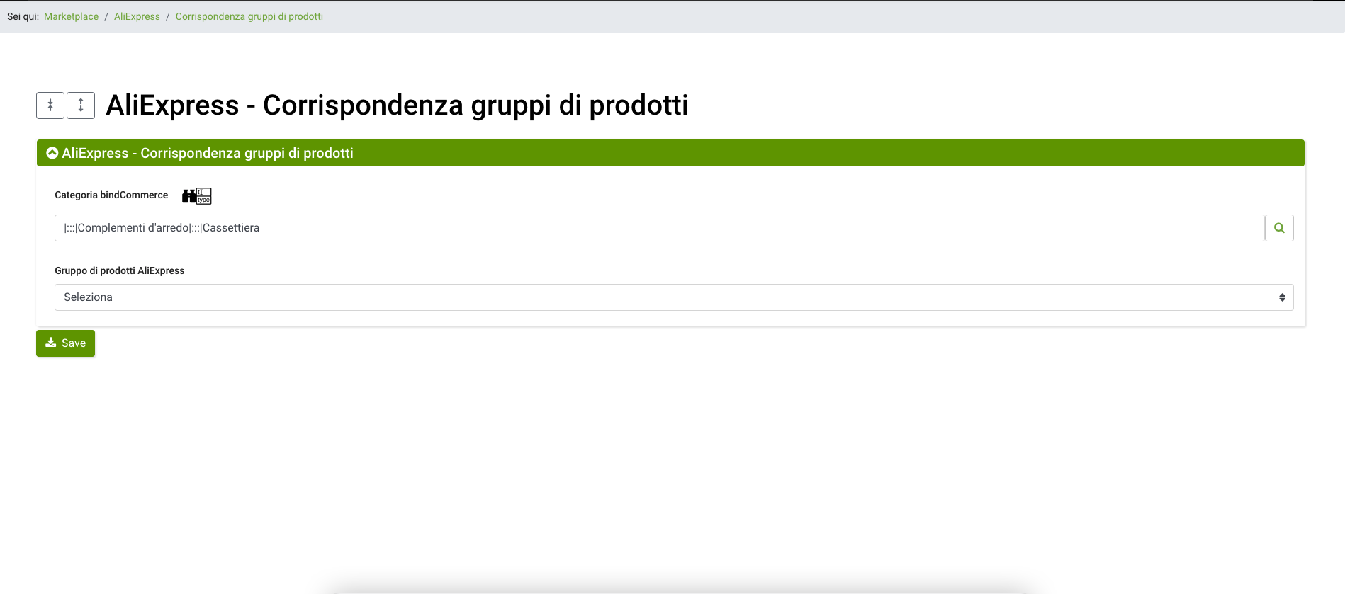 • Categoria bindCommerce: selezionare la categoria bindCommerce che si desidera associare al gruppo di prodotti AliExpress