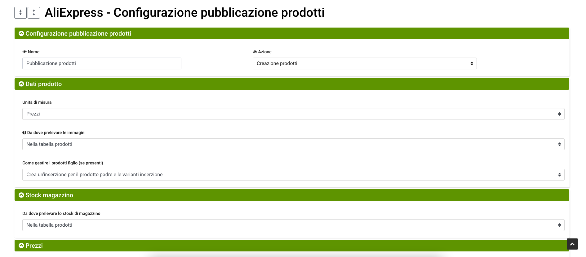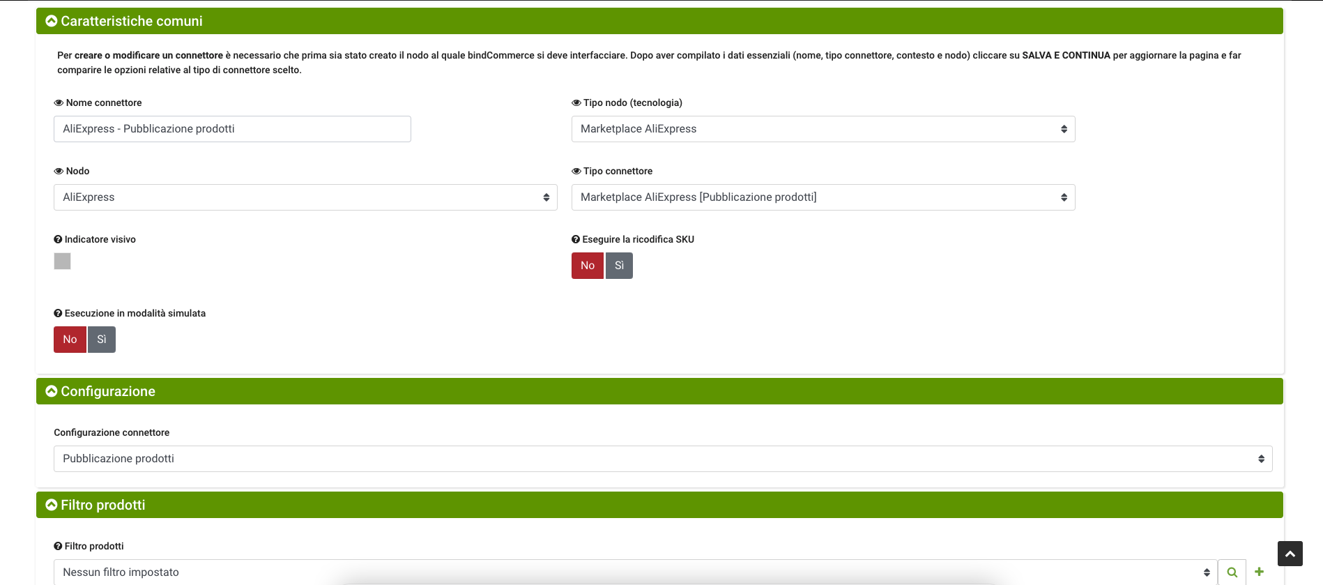 Dopo aver creato il nodo di collegamento tra bindCommerce e AliExpress, ed aver associato le categorie, è possibile procedere con le configurazioni per la pubblicazione degli articoli su AliExpress. Questo tipo di configurazione risulta necessario per determinare quale tipo di operazione il connettore dovrà eseguire e prevede la possibilità di pubblicare su altri mercati oltre a quello principale.