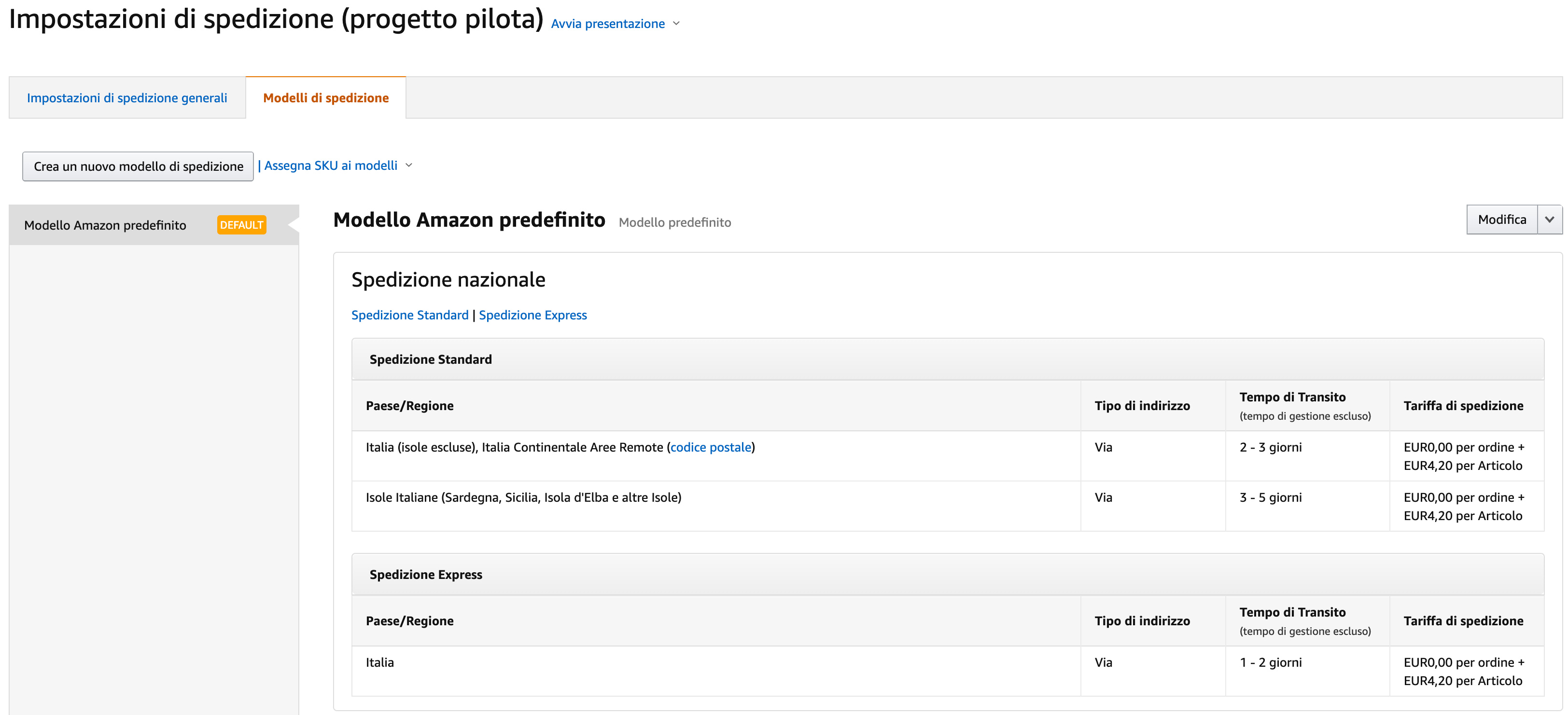 Per gli altri casi, la prima operazione da svolgere è quella di configurare tutti i modelli di spedizione necessari dall'Amazon Seller Central, configurando paesi, tempi e tariffe secondo le proprie necessità.