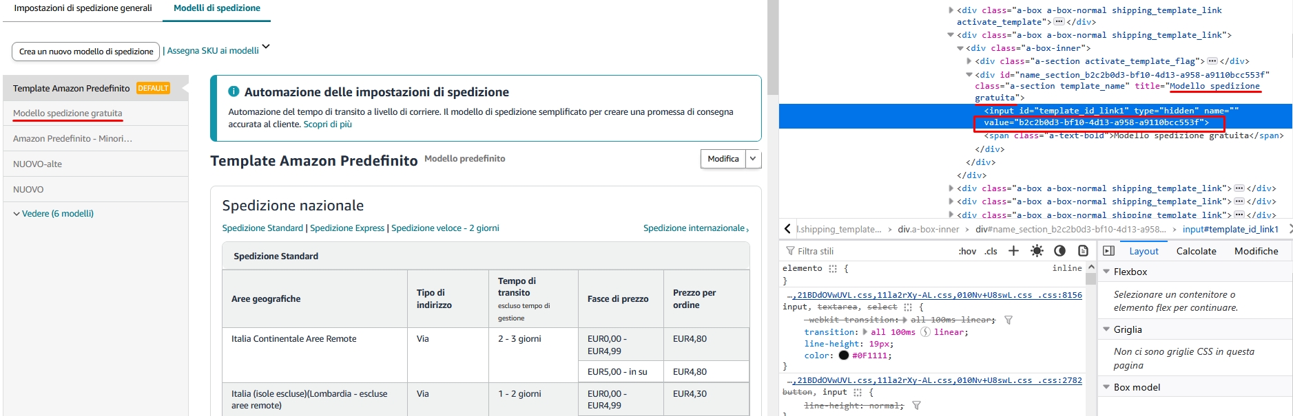 Per ottenere il value di un modello di spedizione, occorre cliccare con il tasto destro sul nome del modello di spedizione e selezionare Ispeziona (oppure Analizza o voce simile a seconda del browser), per visualizzare il codice della pagina. Estrarre il valore del value senza virgolette, nel caso di esempio riportato nell'immagine sottostante, il value del modello di spedizione con nome "Modello spedizione gratuita" è: b2c2b0d3-bf10-4d13-a958-a9110bcc553f.