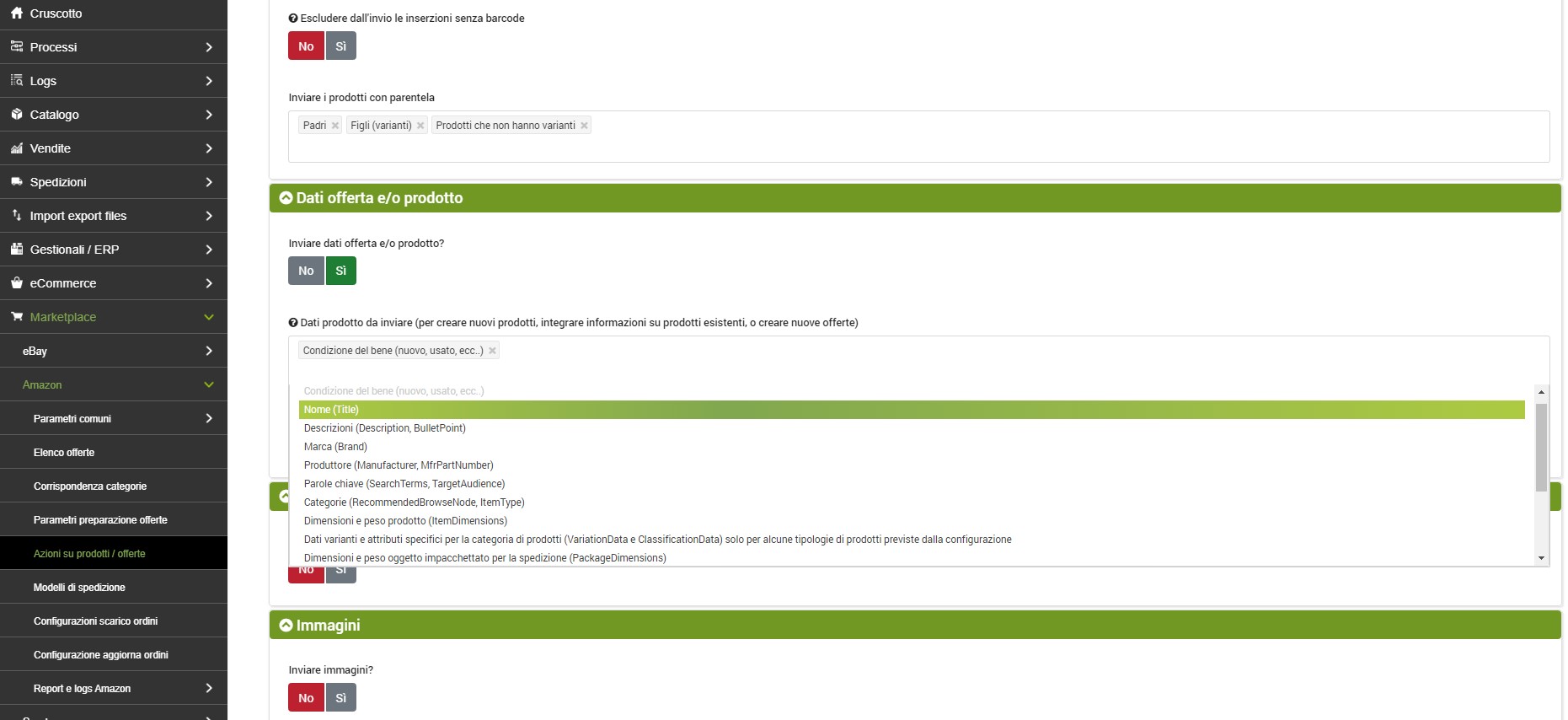 A questo punto è necessario specificare anche nel dettaglio quali dati inviare. Dunque alla sezione Inviare dati offerta e/o prodotto? selezionare Si, per accedere a una serie di opzioni disponibili per l’invio ad Amazon.