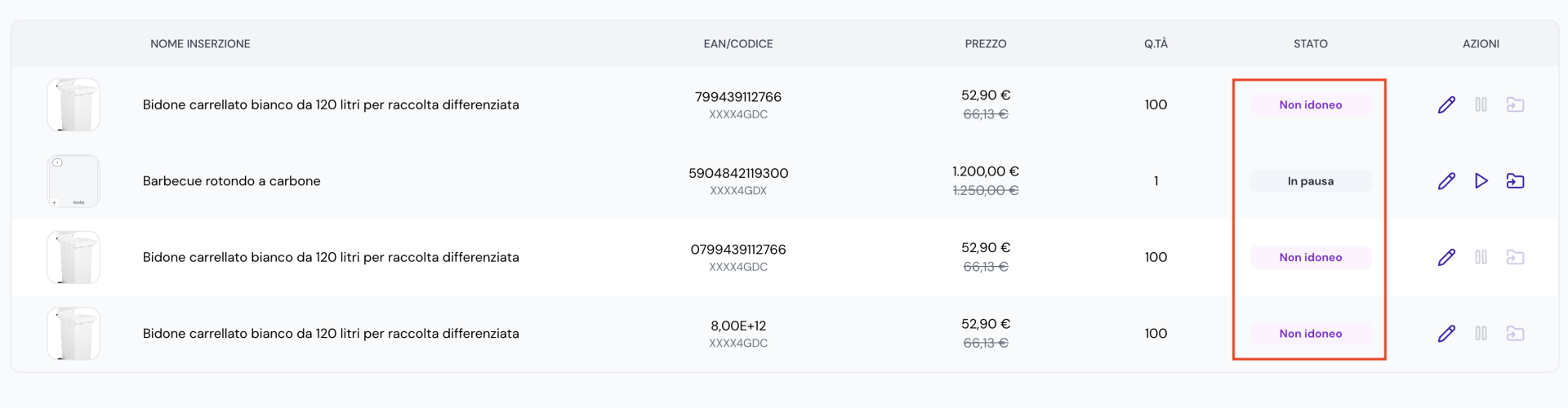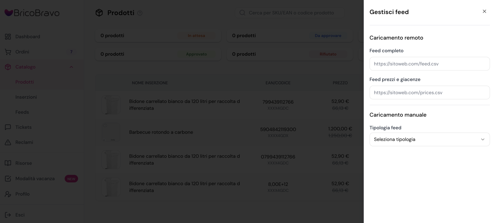 Dopo il caricamento del feed completo, i prodotti vengono sottoposti a una fase di validazione da parte di Brico Bravo, che avviene 2-3 volte al giorno per i nuovi articoli. È possibile monitorare lo stato di approvazione attraverso l’interfaccia: lo stato dei prodotti cambierà progressivamente man mano che vengono approvati.