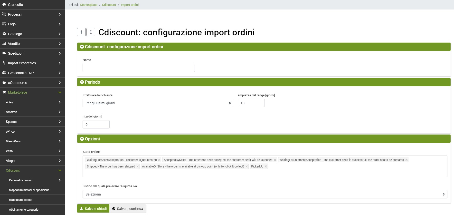 - Tipo di connettore: Marketplace Cdiscount [import ordini]