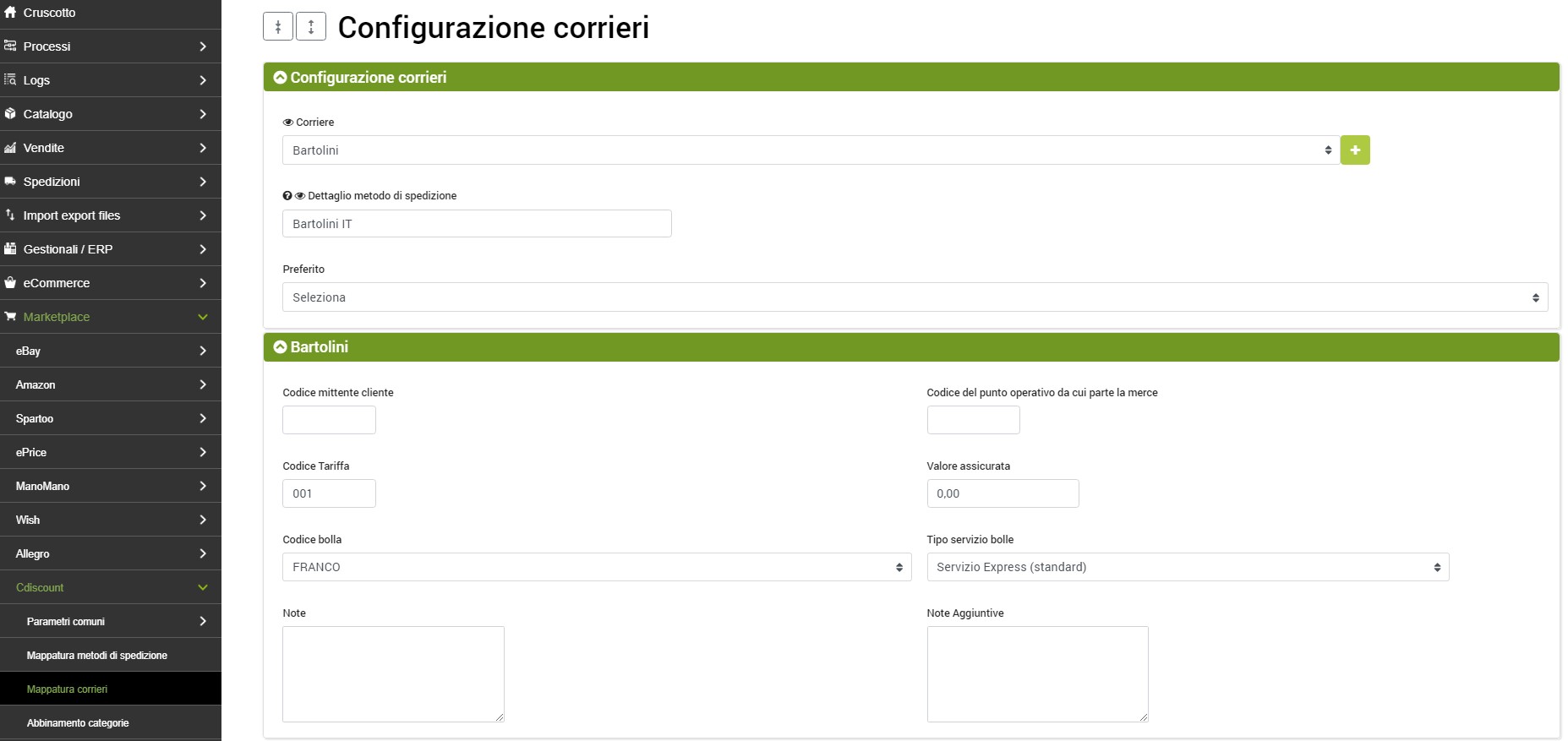 Marketplace >> Cdiscount >> Mappatura corrieri
