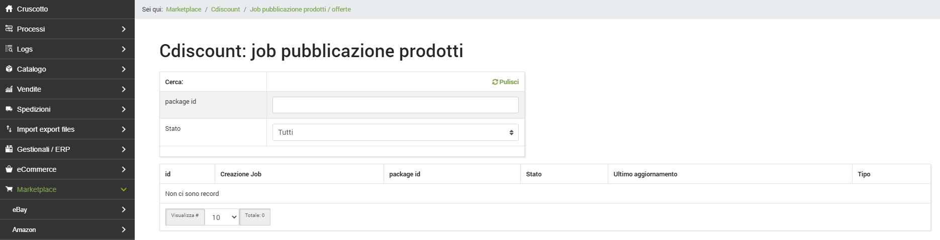 Inoltre su bindCommerce è disponibile una sezione per i job di pubblicazione prodotti/offerte, cioè una tabella all’interno della quale vengono riportati tutti i log specifici dei processi Cdiscount.
