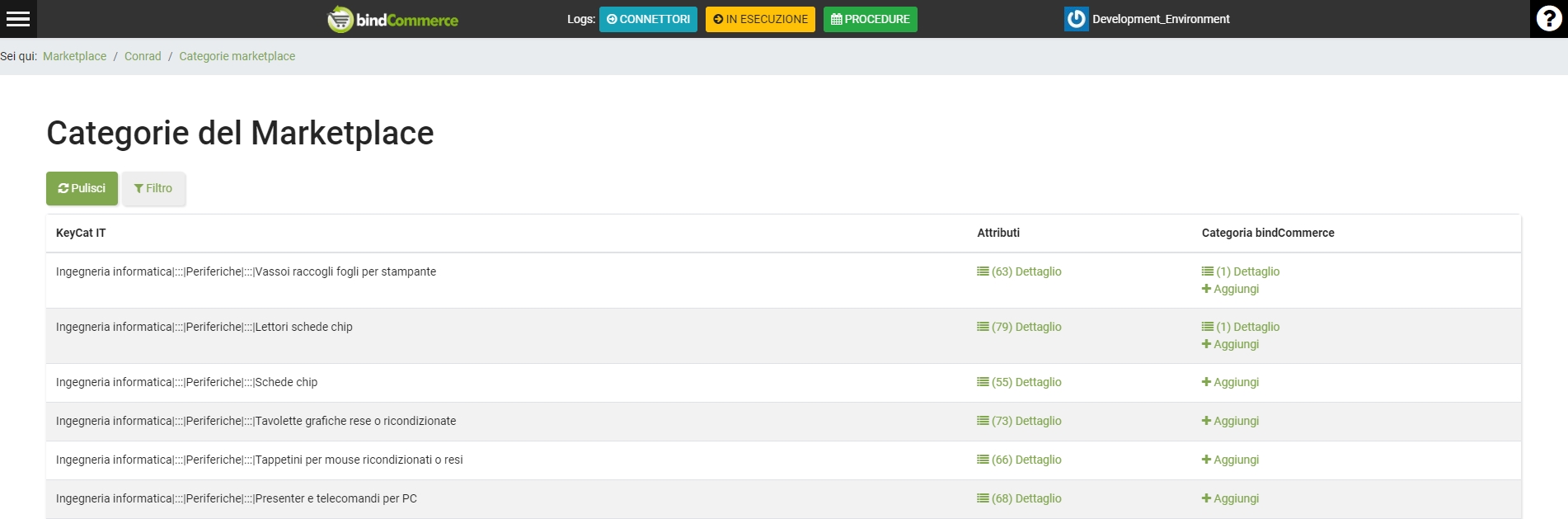 È possibile cliccare su Aggiungi per aggiungere una associazione tra categorie bindCommerce e categoria Conrad o cliccare su Dettaglio per visualizzare o eliminare le associazioni già create.