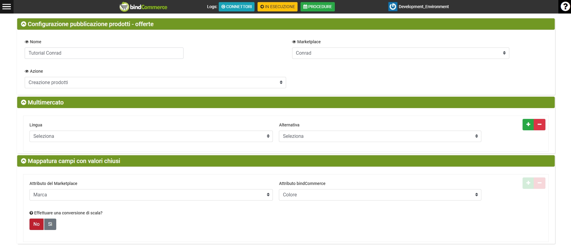 Nota: se i prodotti su bindCommerce dispongono già degli attributi richiesti ma i valori degli attributi non corrispondono a quelli richiesti dal marketplace, è possibile effettuare una conversione di scala (ad esempio nel caso che il prodotto abbia già l'attributo colore con valore "nero" ma il marketplace richieda come valore "dark".