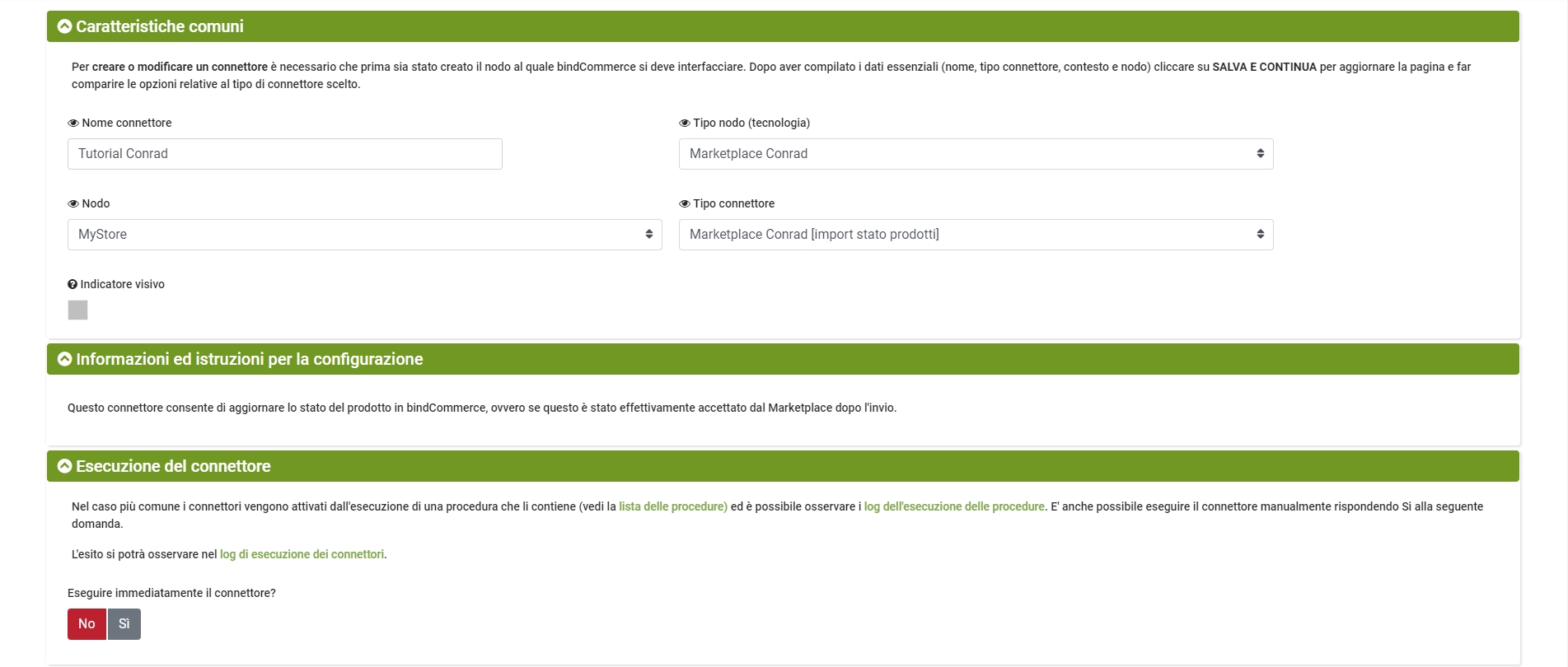 - Esecuzione del connettore: scegliere se il connettore debba essere eseguito immediatamente una volta cliccato su salva