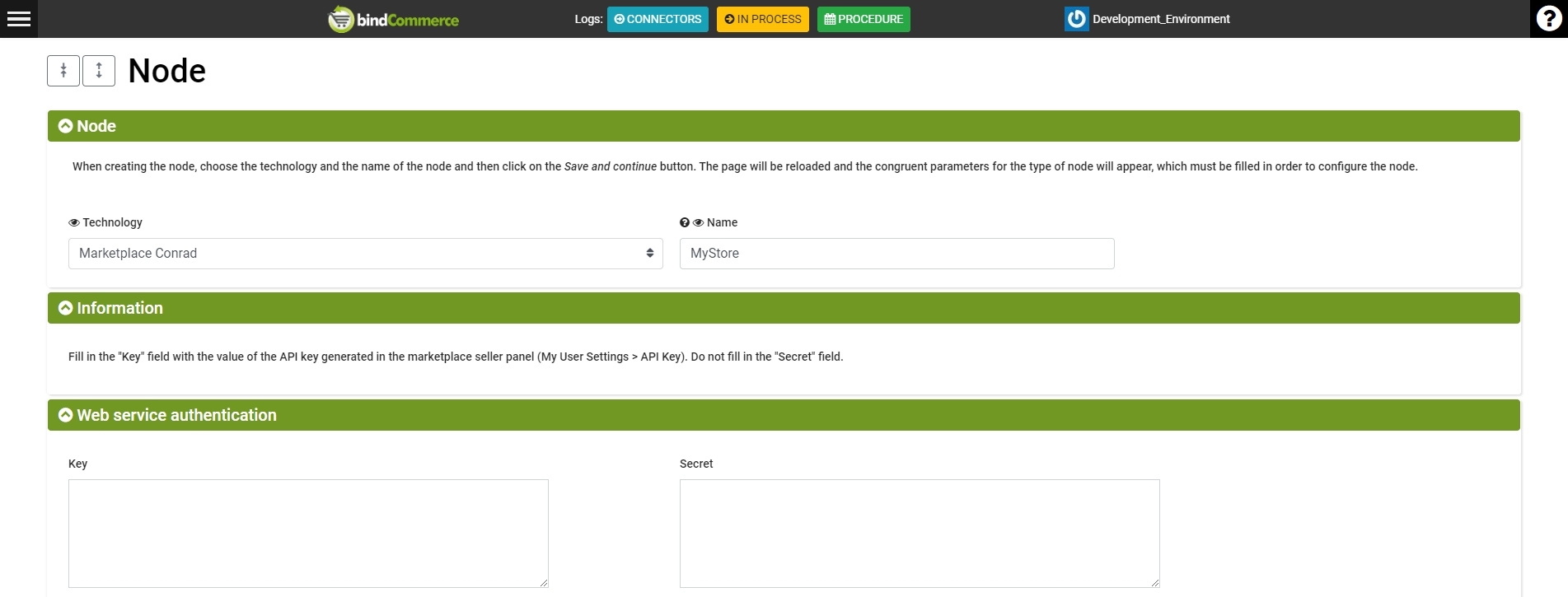 Per consentire a bindCommerce la comunicazione con Conrad è necessario creare un nodo, usando la tecnologia corrispondente.