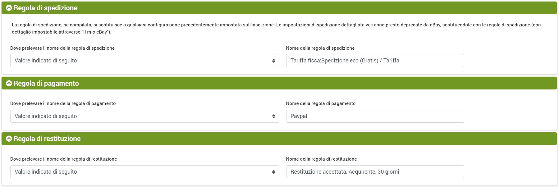 Le regole di vendita sono una funzione opzionale messa a disposizione da eBay e vanno a sostituire le impostazioni di spedizioni impostate direttamente da bindCommerce.