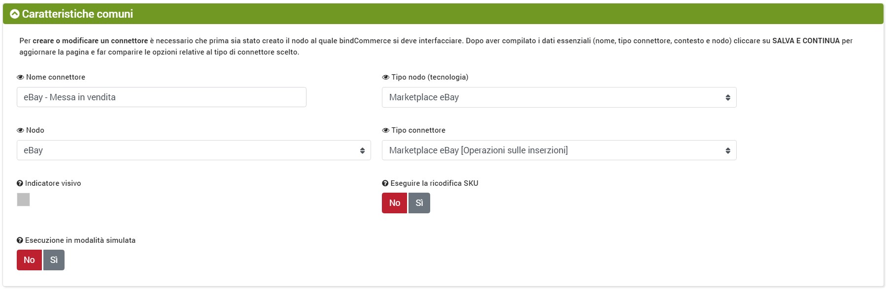 A questo punto occorre scegliere il tipo di tecnologia eBay, il proprio nodo, il tipo di connettore eBay [Operazioni sulle inserzioni] e la configurazione precedentemente creata.