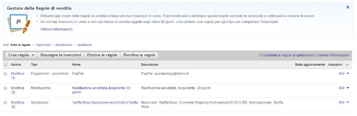 Il link è disponibile dal menù eBay Gestione Inserzioni >> Impostazioni >> Gestore delle regole di vendita.