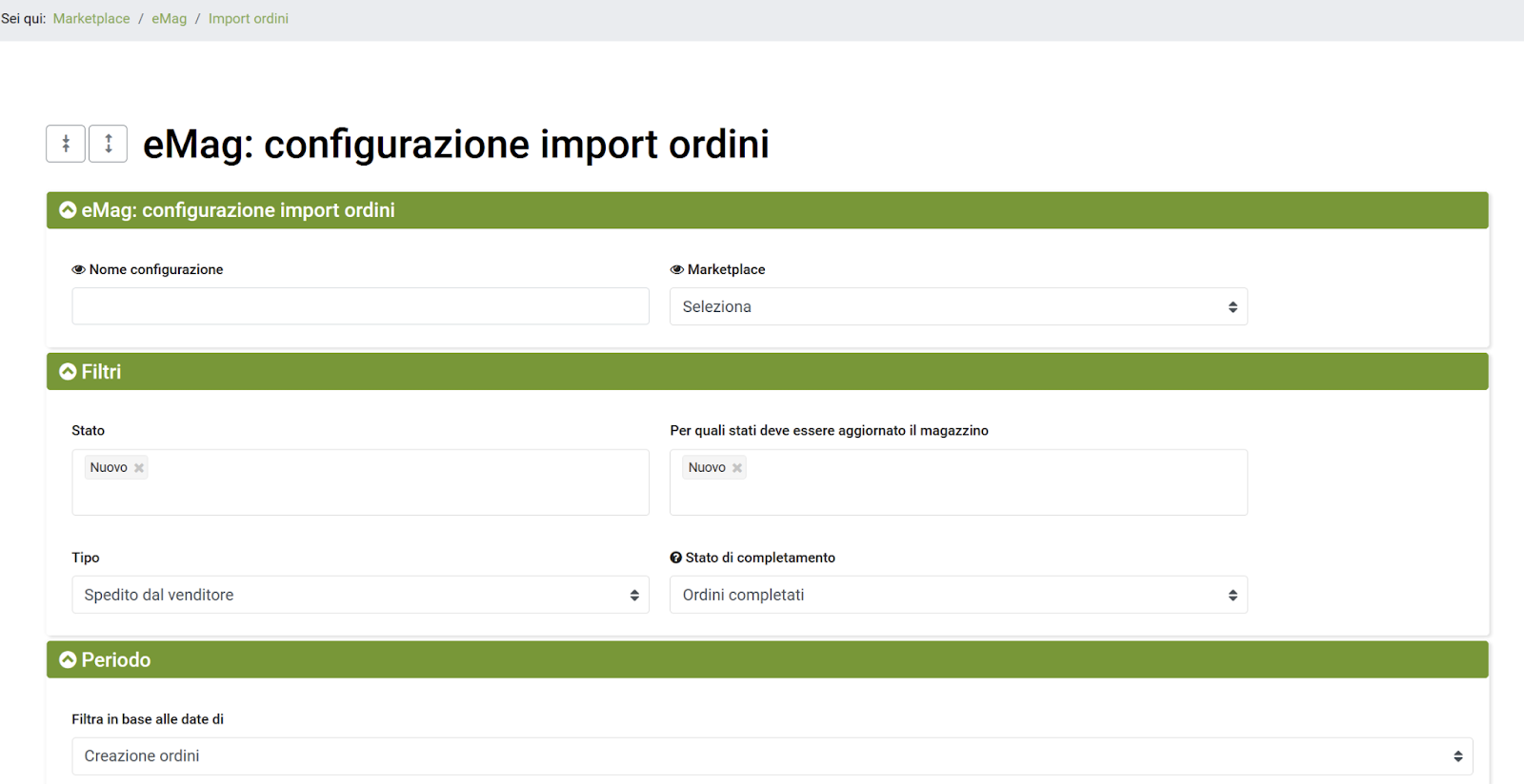 - Marketplace: selezionare il mercato dal quale si desidera scaricare gli ordini, a scelta tra Romania, Bulgaria, Ungheria e Polonia.
