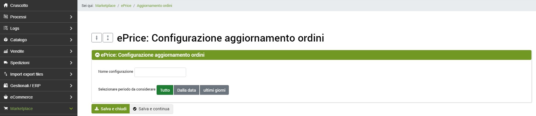 Per aggiornare gli ordini verso il marketplace sarà necessario prima di tutto creare l’apposita configurazione dal menù: