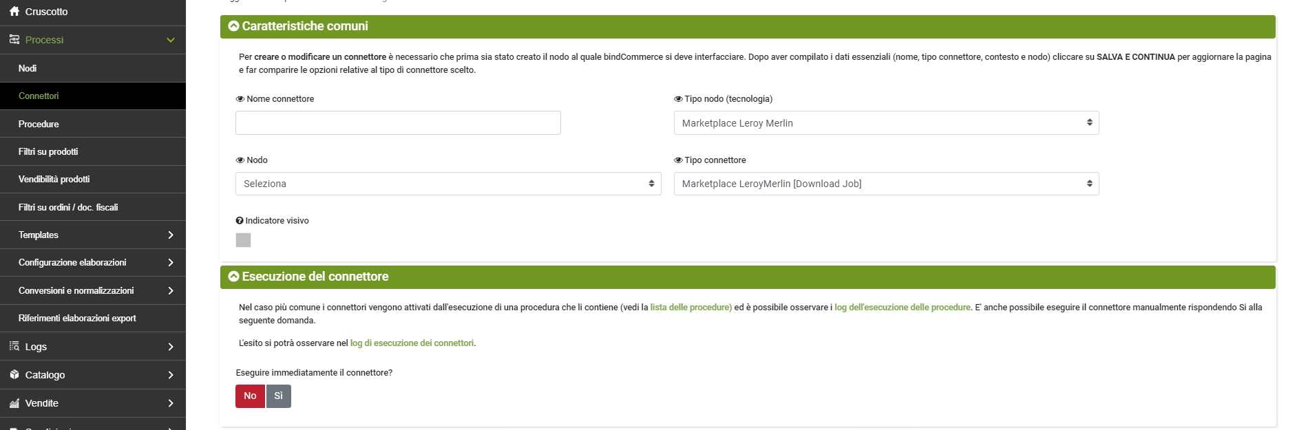 - Esecuzione del connettore: scegliere se il connettore debba essere eseguito immediatamente una volta cliccato su salva