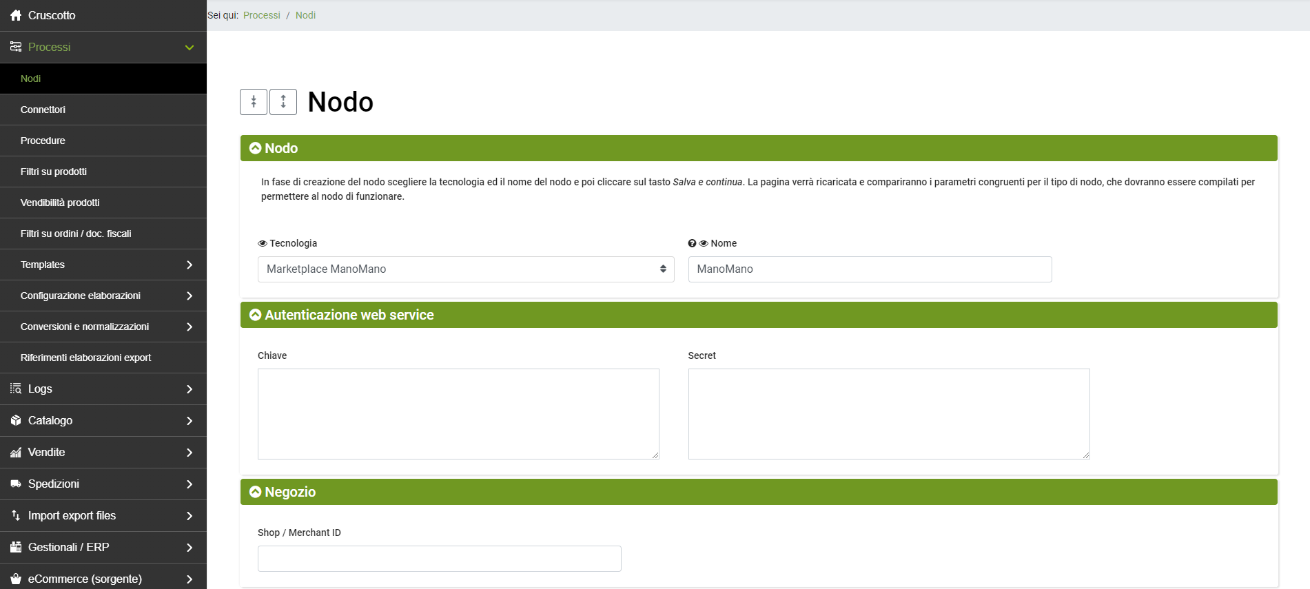Per configurare il nodo è necessario reperire l'ID venditore e la chiave API dal portale ManoMano.