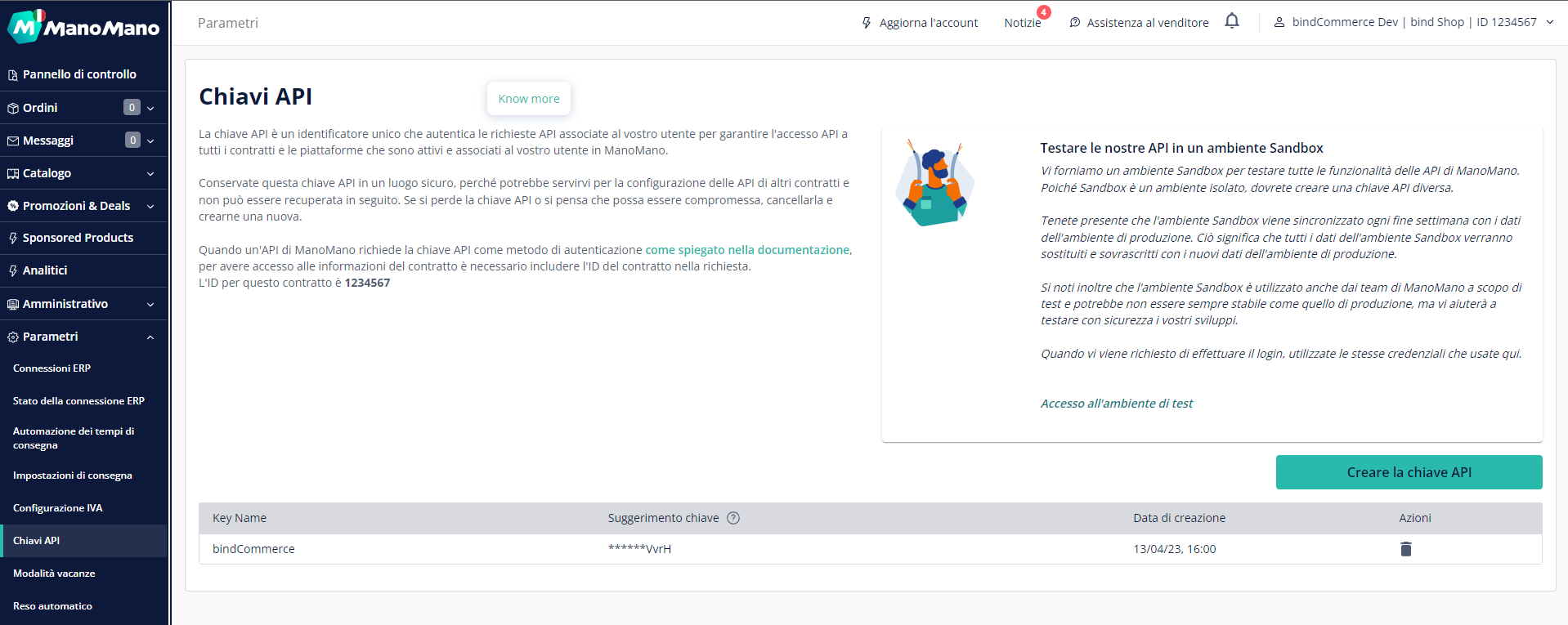 • Chiave: inserire la chiave API ManoMano generata secondo le istruzioni a seguire