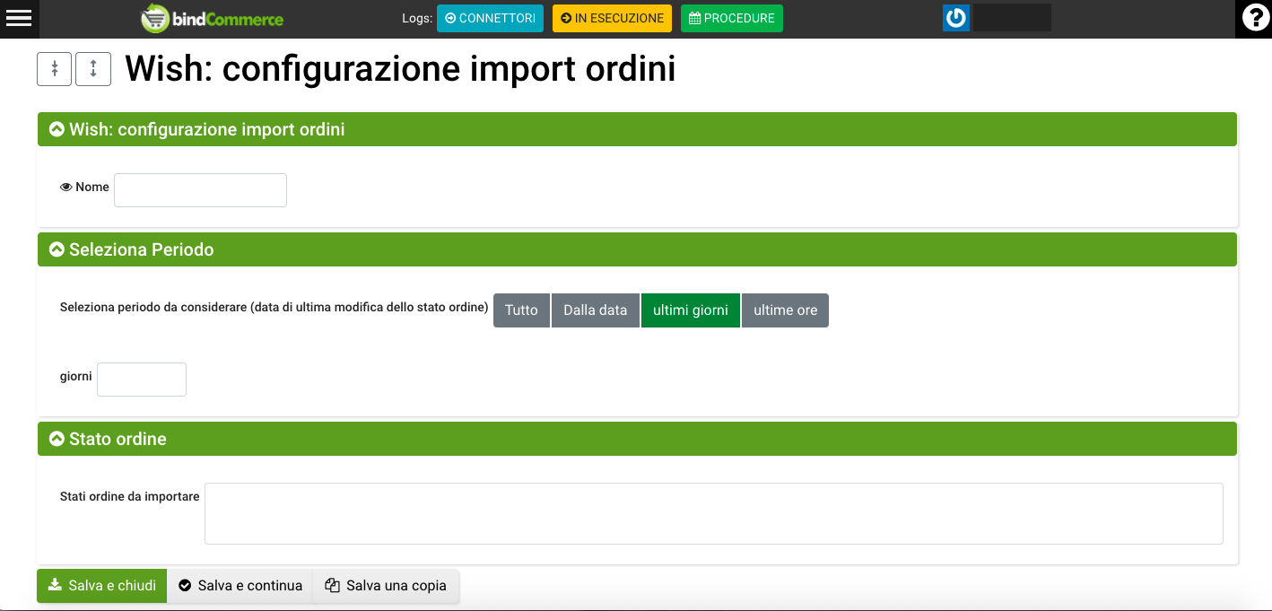 Per effettuare lo scarico ordini da Wish a bindCommerce è necessario creare una configurazione e il relativo connettore.