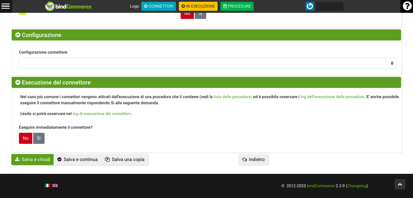 Dopo aver creato la configurazione di scarico ordini, è necessario creare l’apposito connettore, recandosi all’interno del menu bindCommerce