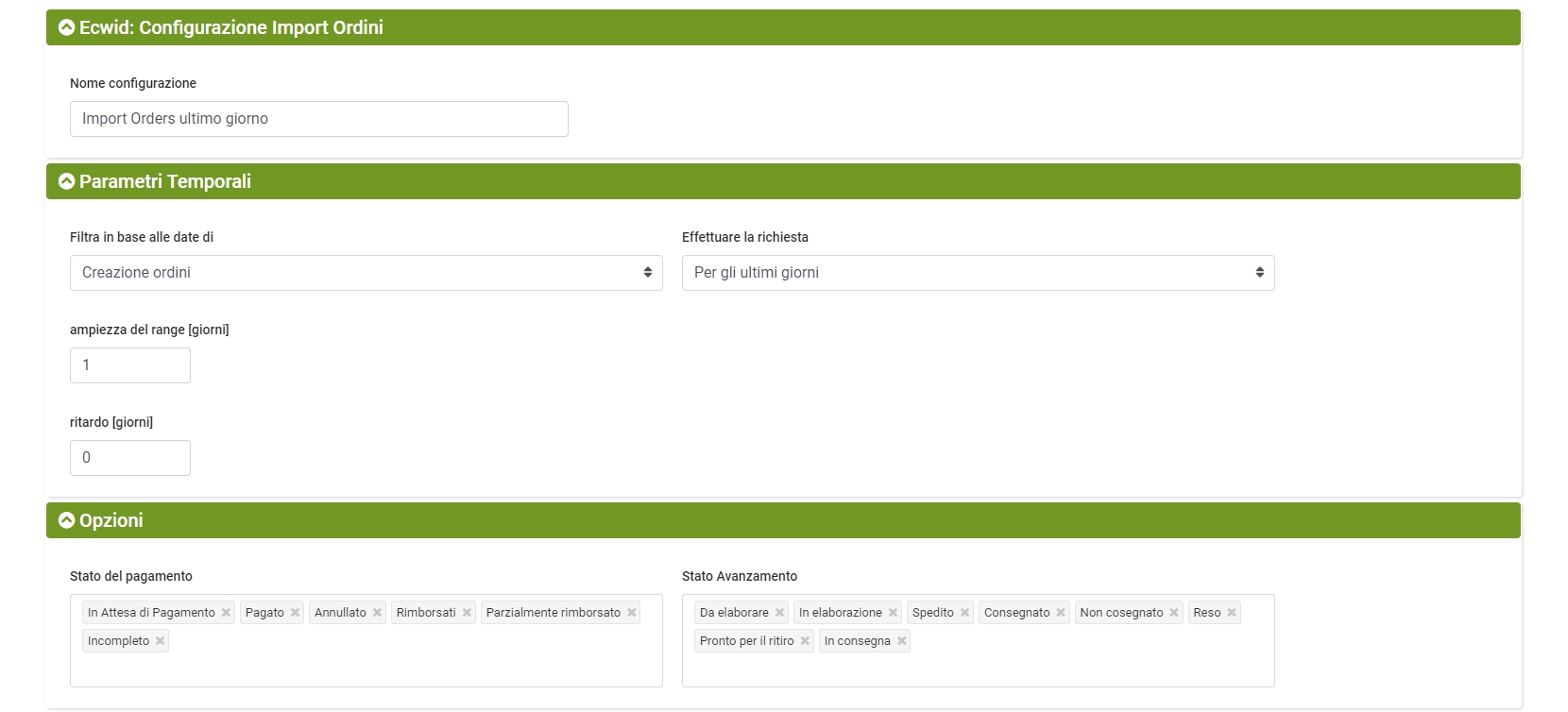 La configurazione import ordini serve per definire quali ordini importare. In caso di particolari necessità è anche possibile creare più configurazioni di import da eseguire in condizioni diverse.